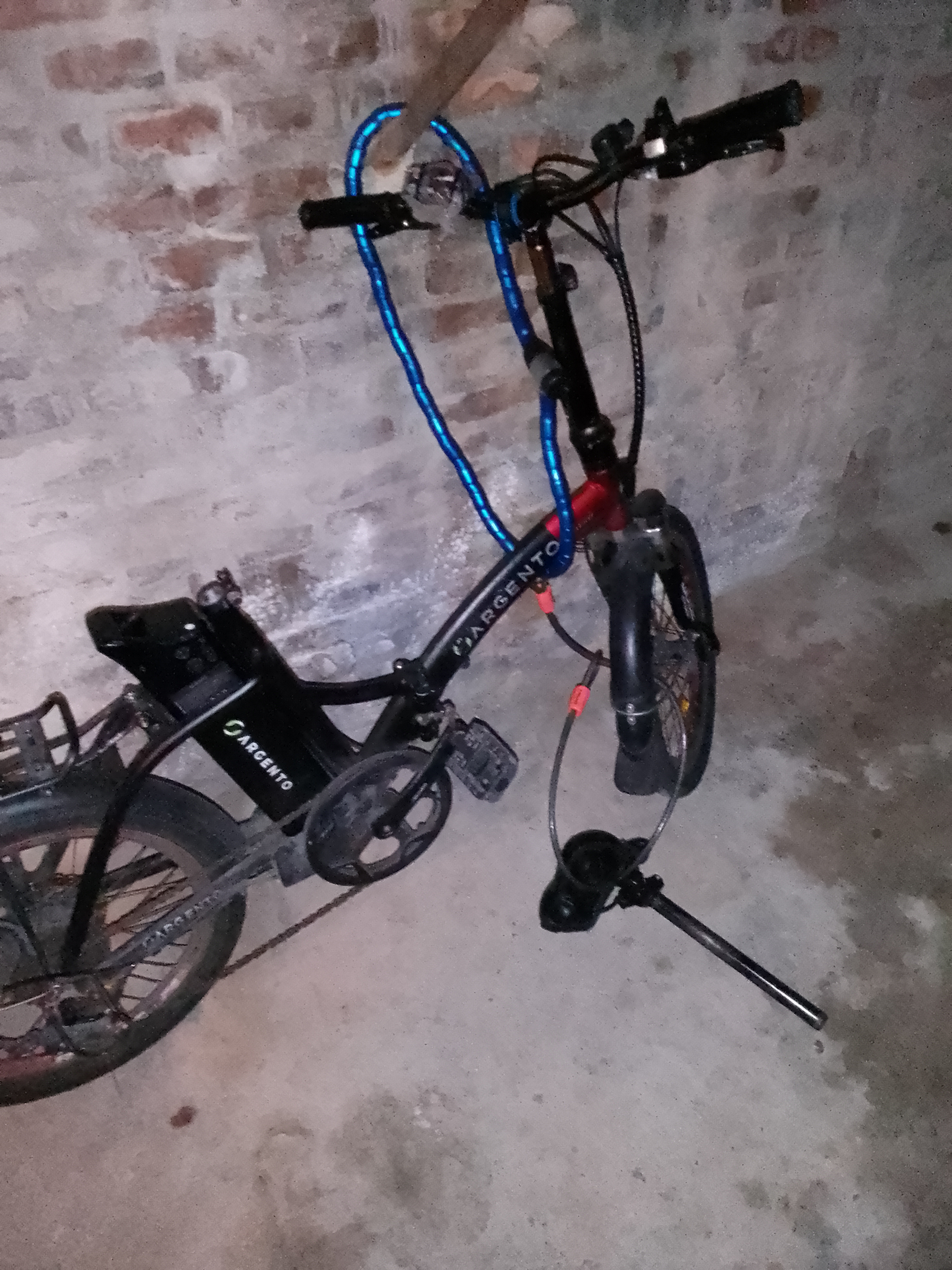 descrizione / segni particolari: Bici pieghevole elettrica, sulla parte sinistra del manubrio l'indicatore della velocità, in quanto è rotto, è avvolto da una bustina di cellofan, legata da due fascette nere. La scritta "Argento Piuma" sul telaio è leggermente abrasa. Il gancio centrale, per la chiusura della bici, è allentato. Manca il catarifrangente della ruota anteriore. La leva del campanello, posizionato a destra sul manubrio, è piegata all'indietro. Il parafanghi anteriore è leggermente scostato su un lato, così come quello posteriore. Il gancio destro del parafanghi posteriore non è avvitato, ma appoggiato sul bullonte della ruota.