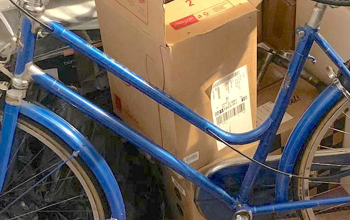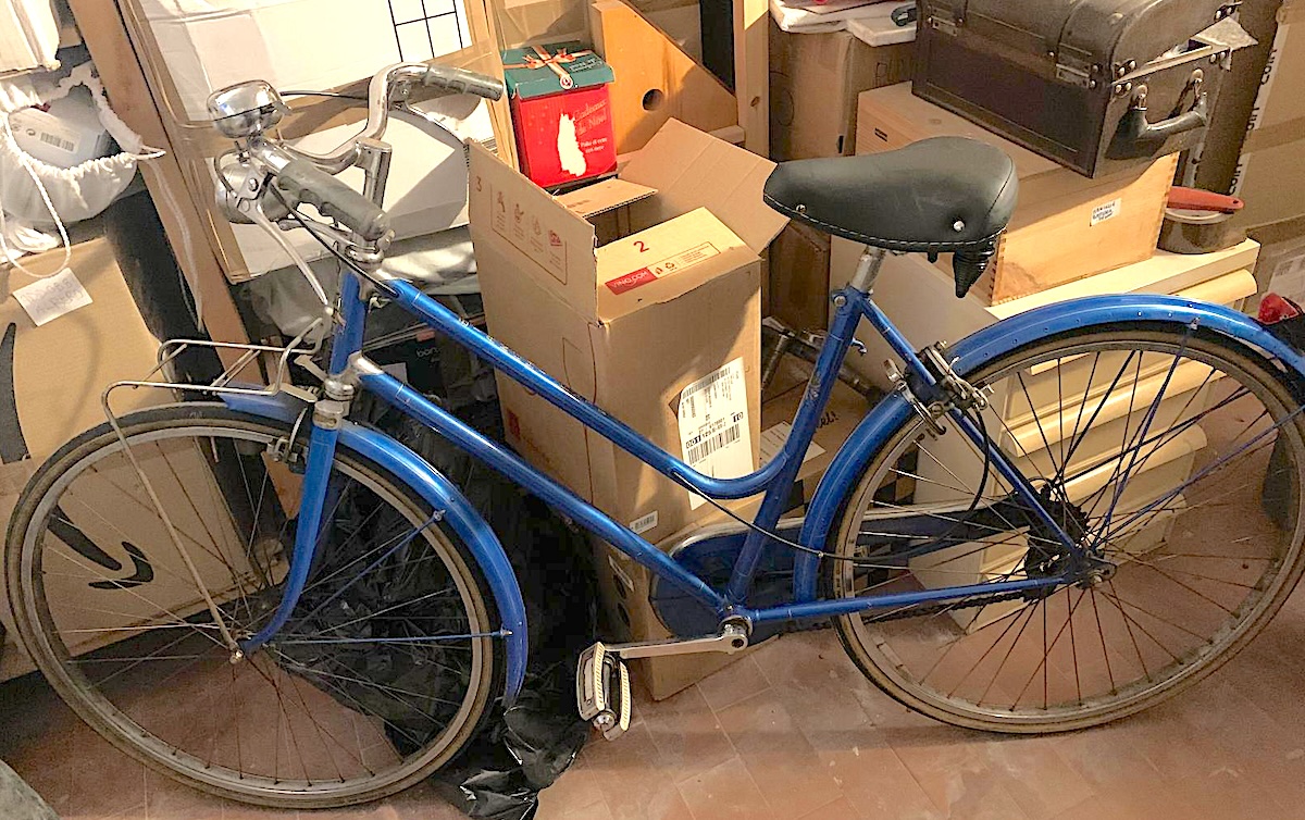 Vintage city bike da donna, telaio blu con giunzioni e la testa forcella cromate e con la scritta BIANCHI sul tubo superiore, sellino nuovo nero