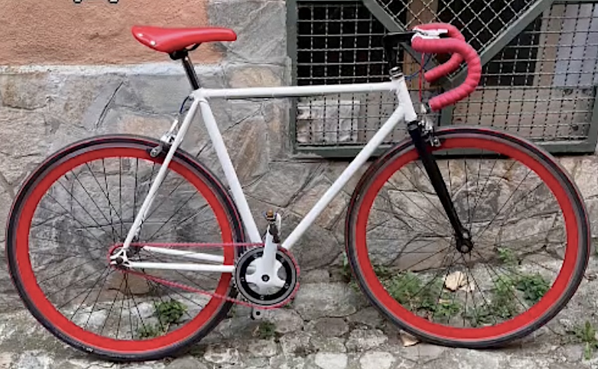 Bici da corsa bianca con ruote e manubrio rosse personalizzata da Bye Bike Baby
