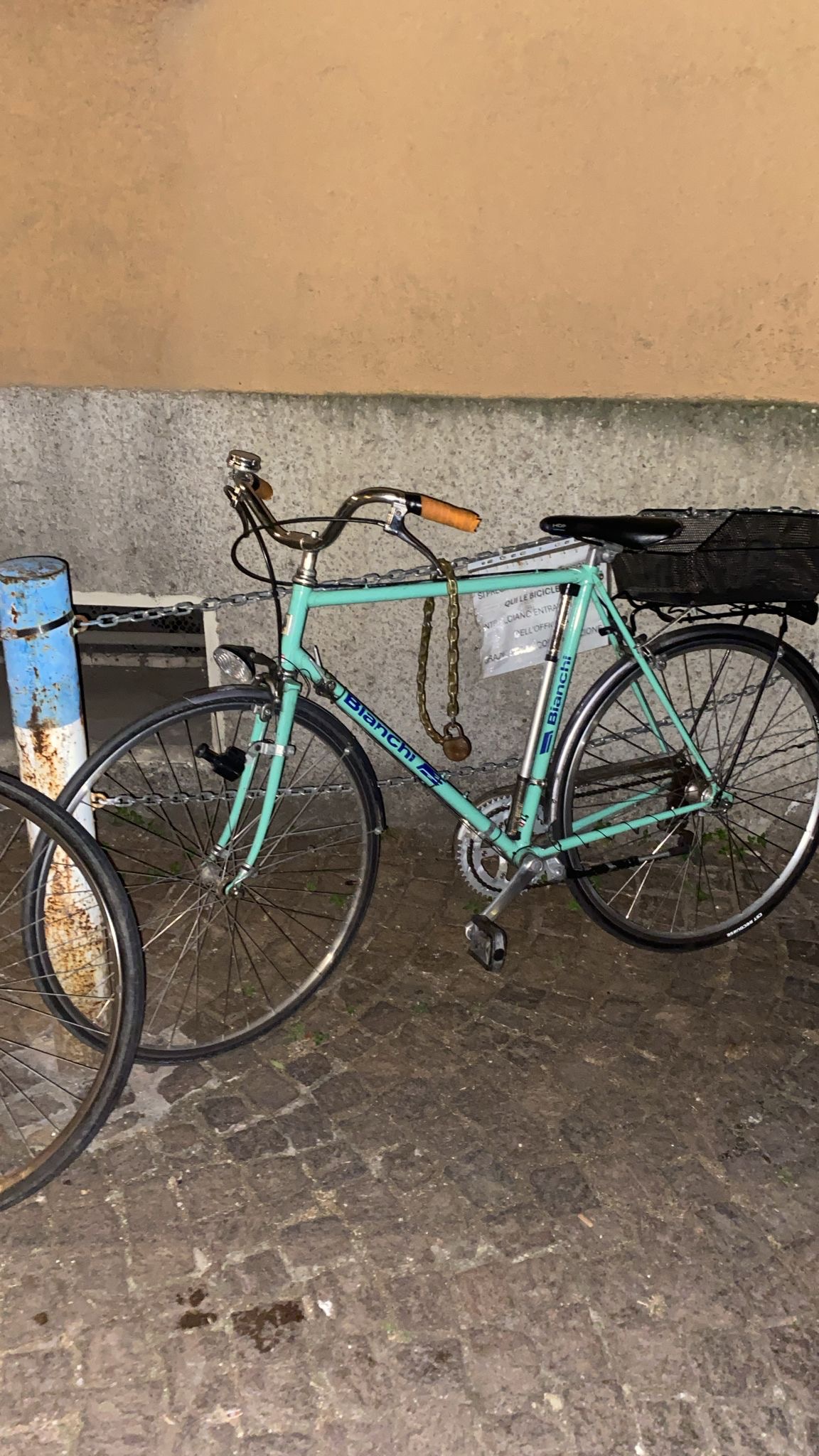 cestino dietro, ruote sottili, luce davanti, manopole nere