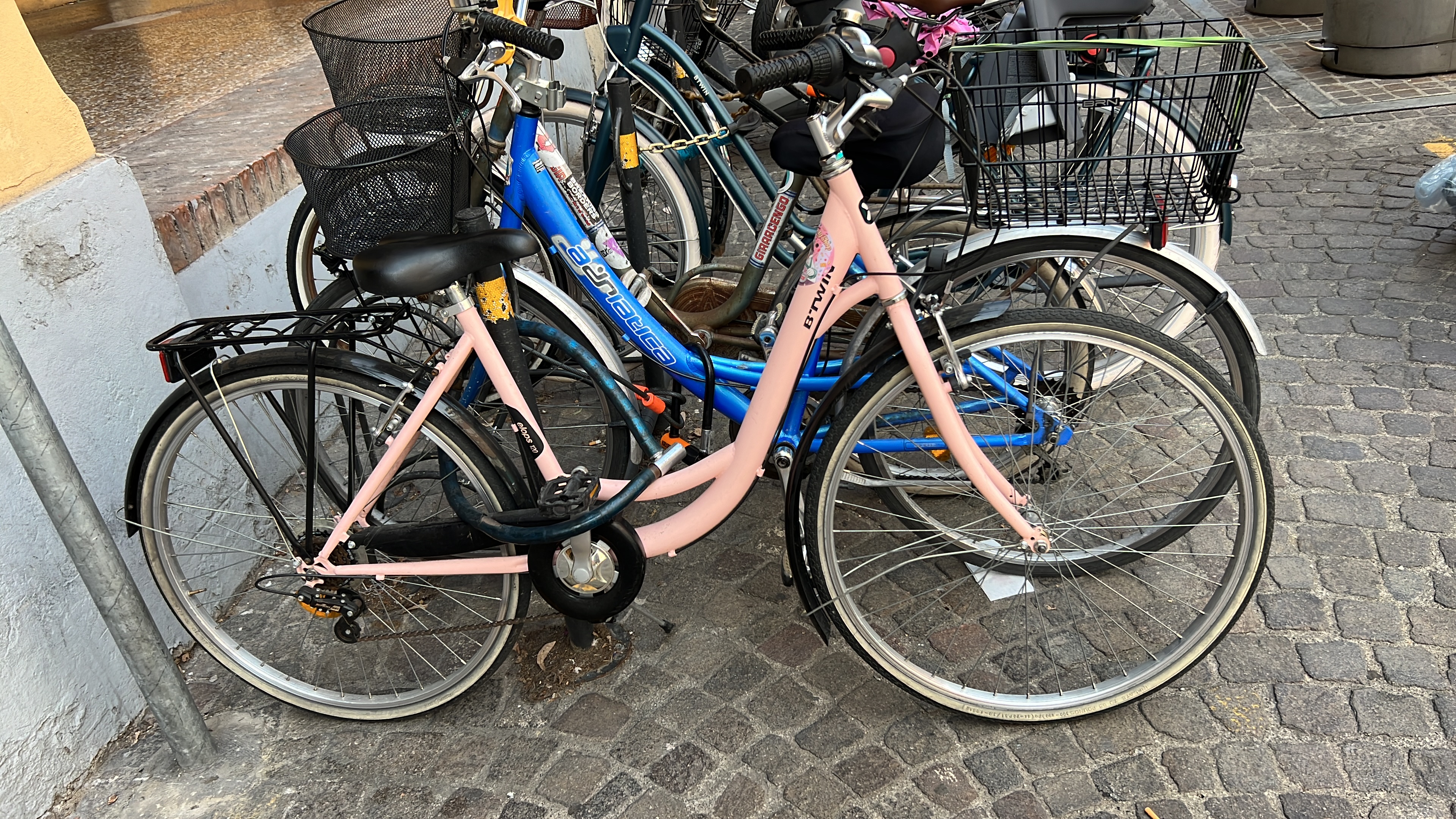 La bici ha diversi anni, ha un cestino rimovibile, il parafanghi davanti è un po' rotto e le manca anche la parte di plastica che copre la catena. Ha uno stickers tondo con un tricheco sul telaio
