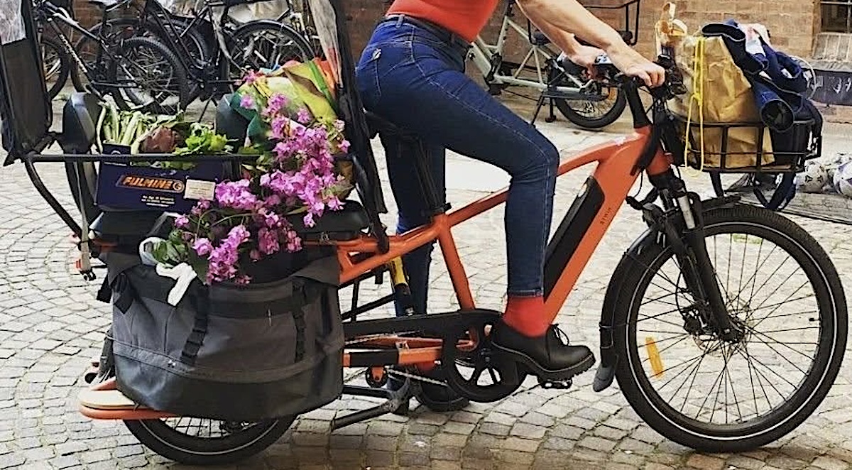 descrizione / segni particolari: Bici cargo bike elettrica a pedalata assistita, telaio colore è particolare rosa salmone / arancio, Ha montata la cappottino con telaio, al manubrio lato destro c'era appesa la piastrina consumata dei freni a disco con una fascetta.