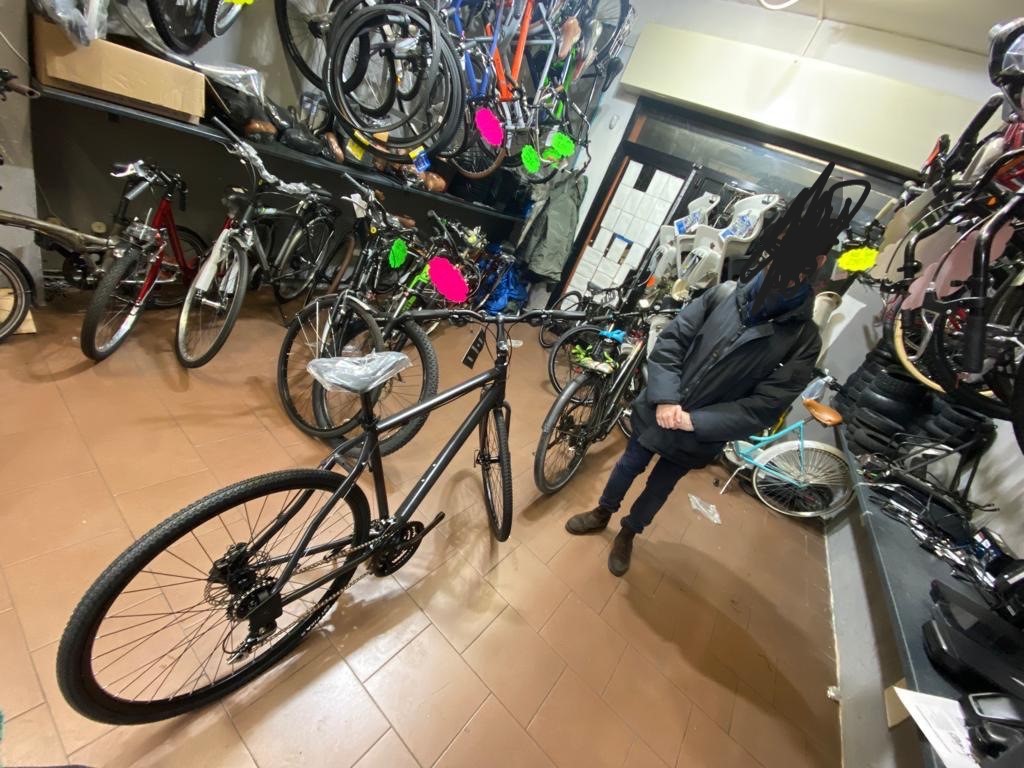 descrizione / segni particolari: telaio gravel in alluminio con manubrio mobile e freni a disco idraulici; colore completamente nera; accessoriata con parafanghi davanti e dietro + cestino quadrato davanti + cavalletta; era un po' sporca di fango, soprattutto sulle ruote; 2 catenacci, una grossa catena con copertura attaccata al cestino e un kryptonite a U attaccato al telaio e con cui era legata al palo.