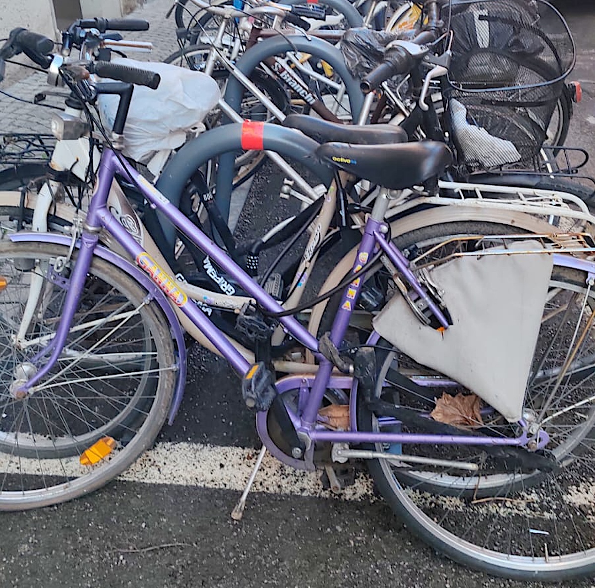 bicicletta Ganna da danna di colore lilla con pararaggi in tessuto grigio, con adesivi scritta Ganna di colore giallo arancio uno posizionato sotto il reggisella e l'altro sulla parte centrale del telaio